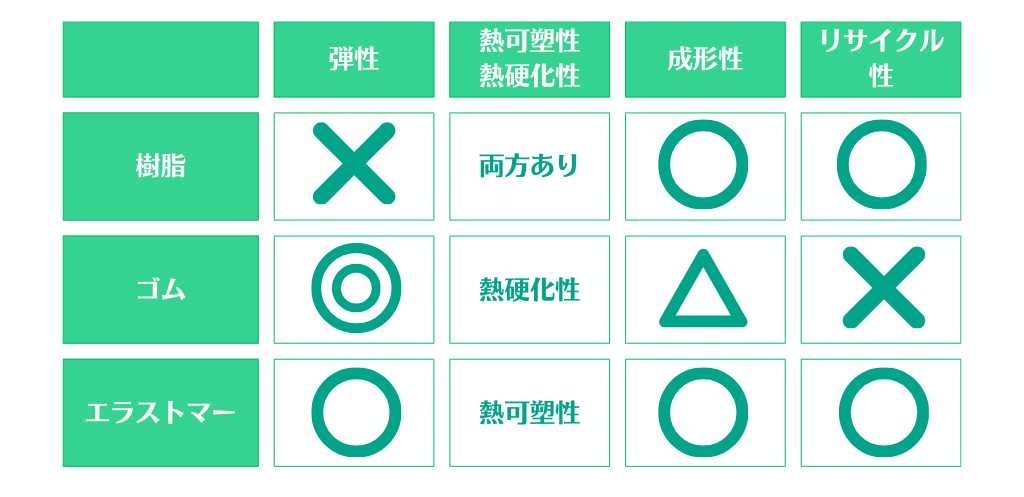 工業用材料として比較する場合、主要要因になるのは「弾性」、「熱可塑性/熱硬化性」、「成形性」の3点です。