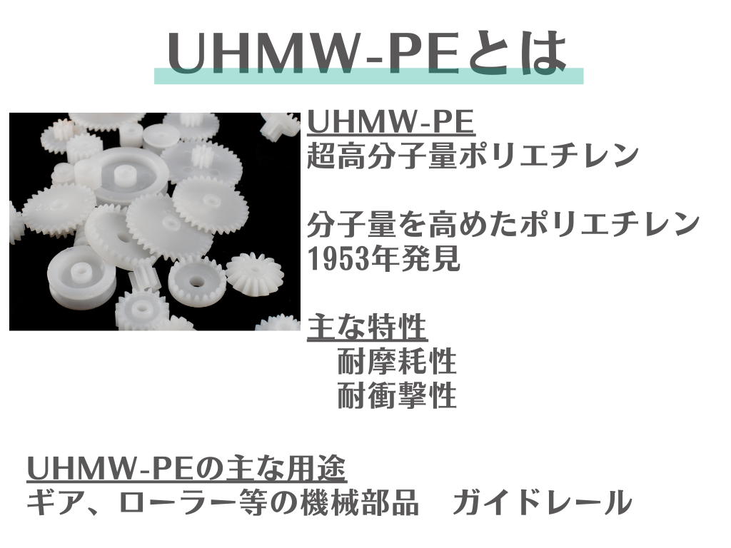UHMW-PE(超高分子量ポリエチレン)は分子量がとても多い樹脂素材で、1953年に発見されました。