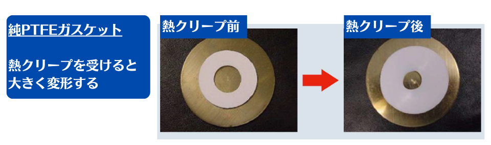 PTFEは耐熱性こそ高いものの、熱可塑性樹脂のため温度が高い環境ではクリープ変形が発生します。